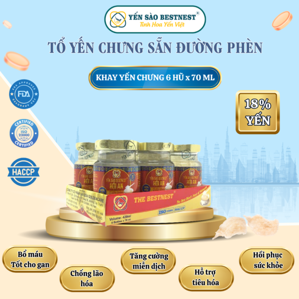 Khay 6 hũ yến chưng sẵn đường phèn Hội An có công dụng rất tuyệt vời cho sức khỏe con người. Bởi nhiều người thường lo lắng rằng, yến chưng sẵn với hương vị khác có thể làm biến đổi chất, mất đi thành phần dinh dưỡng khi chưng nấu.